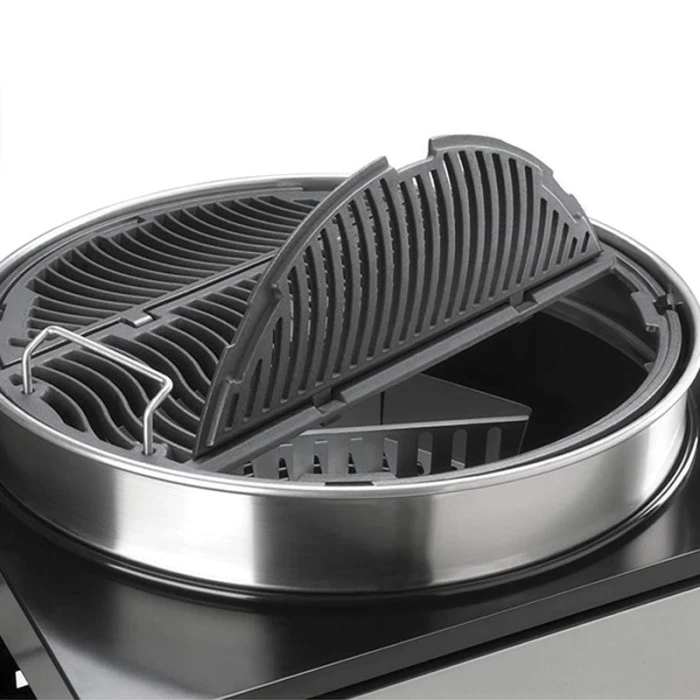 La cuve émaillée en porcelaine assure une parfaite diffusion de la chaleur. Cuisson directe ou indirecte, tous les types de cuisson sont possibles. Pour réaliser des cuissons indirectes, des paniers à charbon en inox sont livrés avec le barbecue. En fond de cuve, une grille foyère permet de protéger la cuve du contact direct avec les charbons ardents mais aussi d’assurer leur parfaite combustion grâce à l’apport d’air.