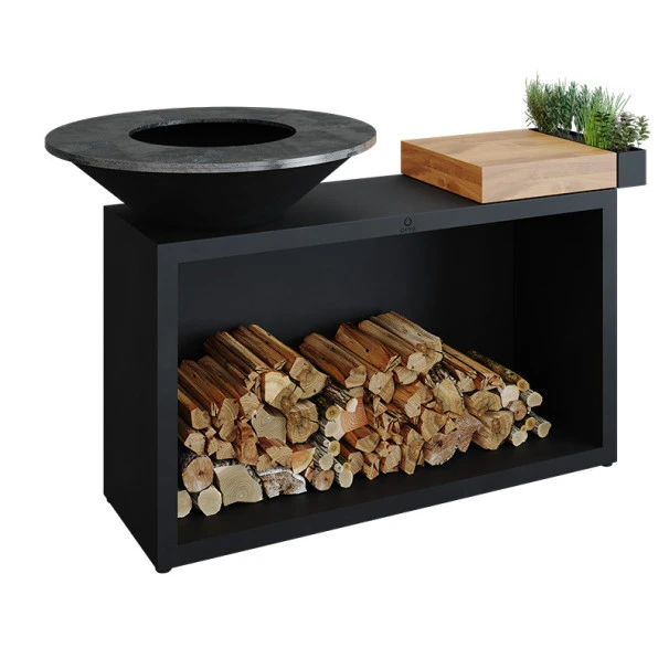 Présentation du braséro plancha OFYR Island 85 noir avec plan de travail en céramique anthracite :