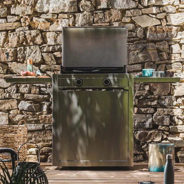 Moderne, solide et tout terrain, ce chariot en inox est adapté à recevoir une plancha Modern 60 de la marque forge Adour.
