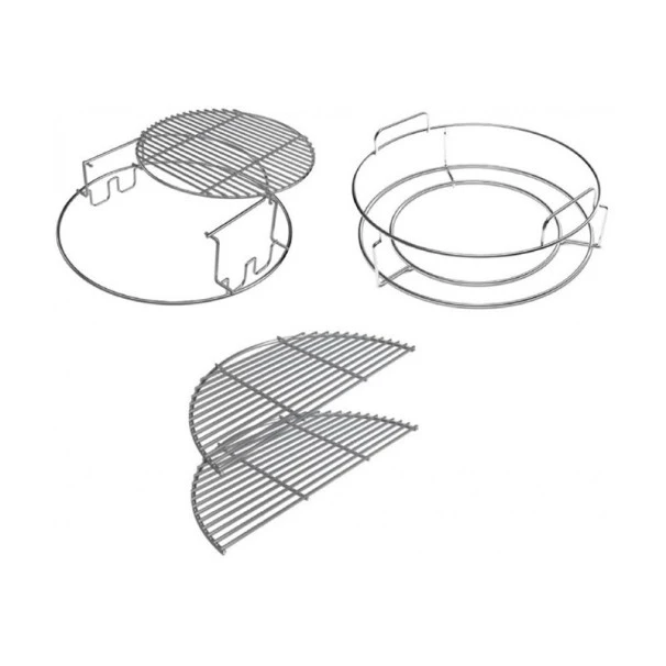 Ce kit d’extension à 5 accessoires vous permettra de créer une infinité de configurations pour profiter au mieux de votre barbecue kamado Big Green Egg. Il vous permet d’élever vos cuissons, de les abaisser, de doubler votre surface de cuisson. Avec d’autres accessoires en option vous pourrez même cuire deux pizzas à la fois, griller façon Cow Boy (au plus près du charbon) et bien d’autres façons.